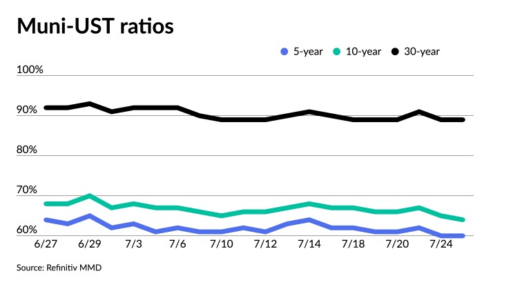 The two-year muni-to-Treasury ratio Tuesday was at 58%, the three-year at 59%, the five-year at 60%, the 10-year at 64% and the 30-year at 88%, according to Refinitiv MMD’s 3 p.m. read. ICE Data Services had the two-year at 59%, the three-year at 60%, the five-year at 60%, the 10-year at 64% and the 30-year at 88% at 4 p.m.