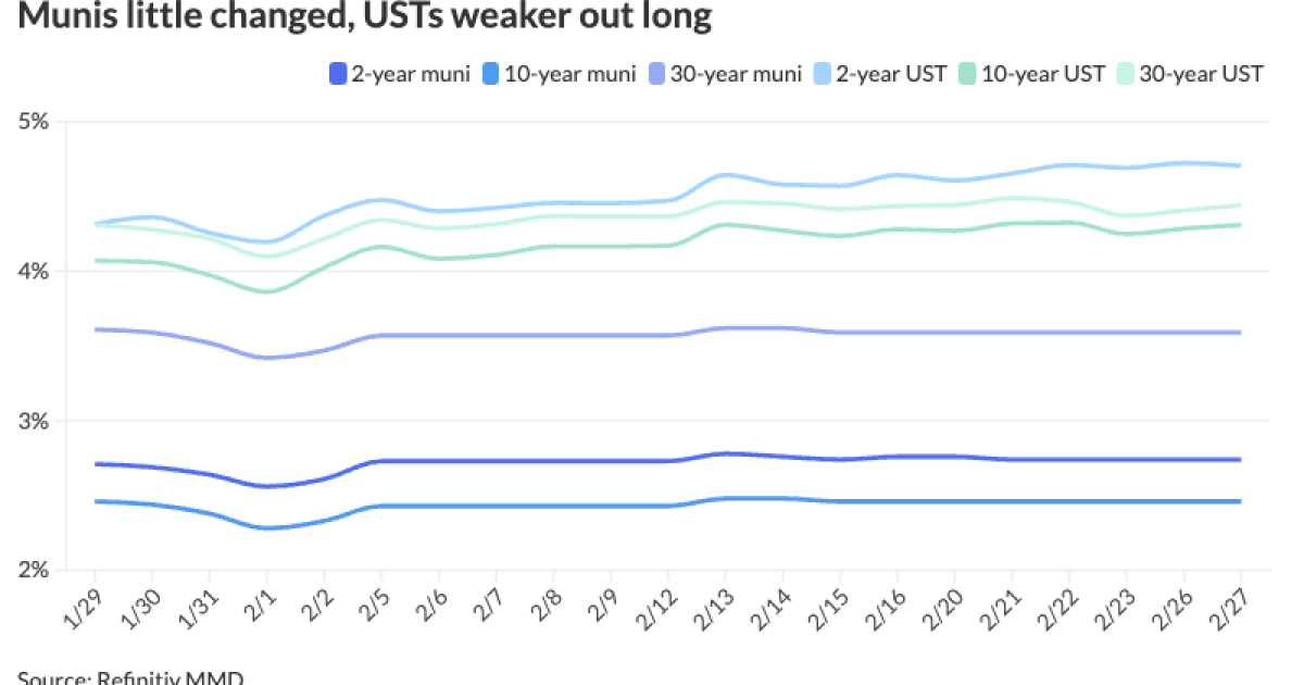 The S&P Global Market Intelligence municipal curve was little changed: The one-year was at 2.96% (+1) in 2025 and 2.74% (unch) in 2026. The five-year was at 2.44% (unch), the 10-year was at 2.47% (unch) and the 30-year yield was at 3.57% (unch), according to a 3 p.m. read.